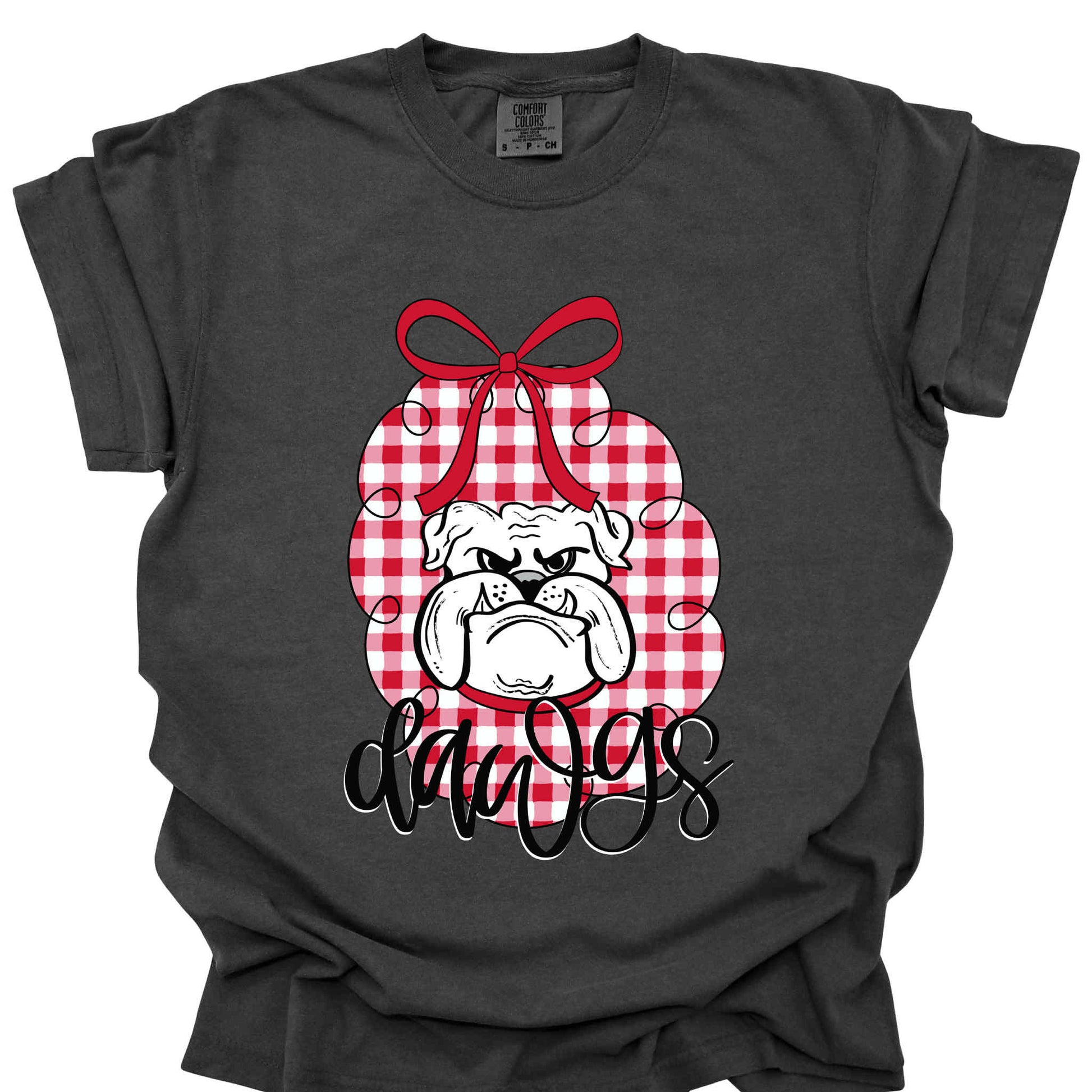Featuring a bulldog with a cute bow and checkered background design! This super soft and cute shirt adds a cool, laid-back vibe that pairs effortlessly with jeans, leggings, or your favorite jacket.