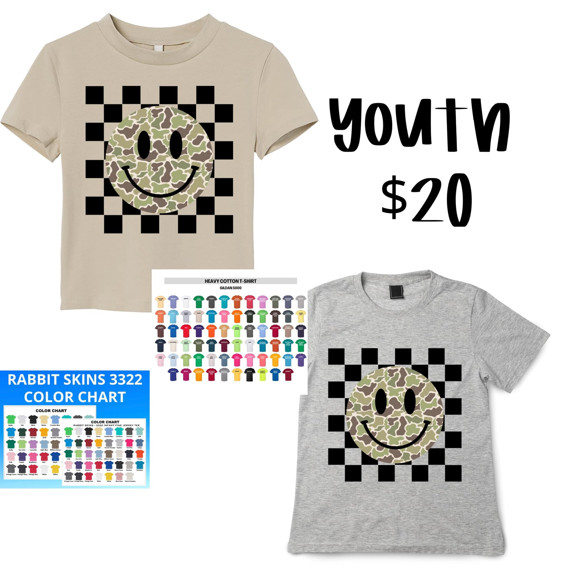 A bold mix of playful and trendy, the Youth Camo Smiley Checkered Tee is perfect for kids who love to stand out! The classic smiley face gets a fresh upgrade with a camo print, set against a cool checkered backdrop for extra style points. Made with soft, breathable fabric, this tee is as comfy as it is eye-catching—perfect for everyday adventures.